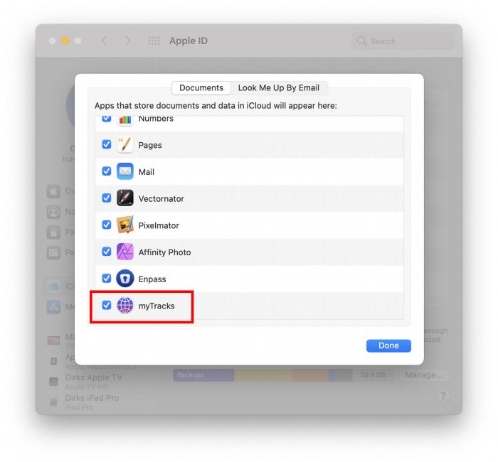 Please open the Options of iCloud Drive and check whether myTracks is enabled: