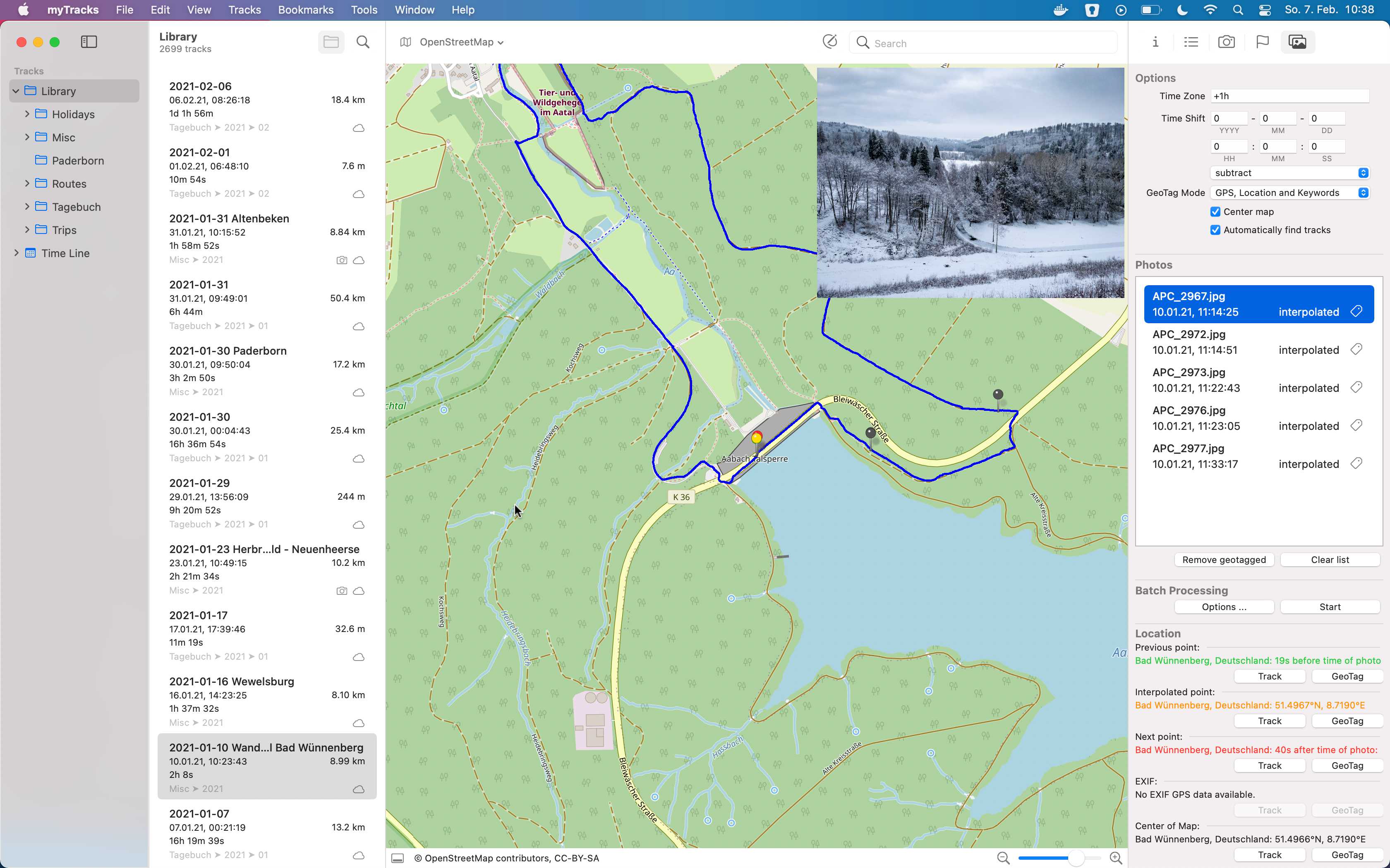 Besides the 1-Click Geotagging there is another geotagging mode available in myTracks. The workflow looks different. The photos are not automatically synchronized with the tracks but they are put into a pool first. Then you have the full control over time zone, time correction, etc. For each single photo you can decide how the geotagging has to be performed (previous track point, next track point, interpolation, etc.).